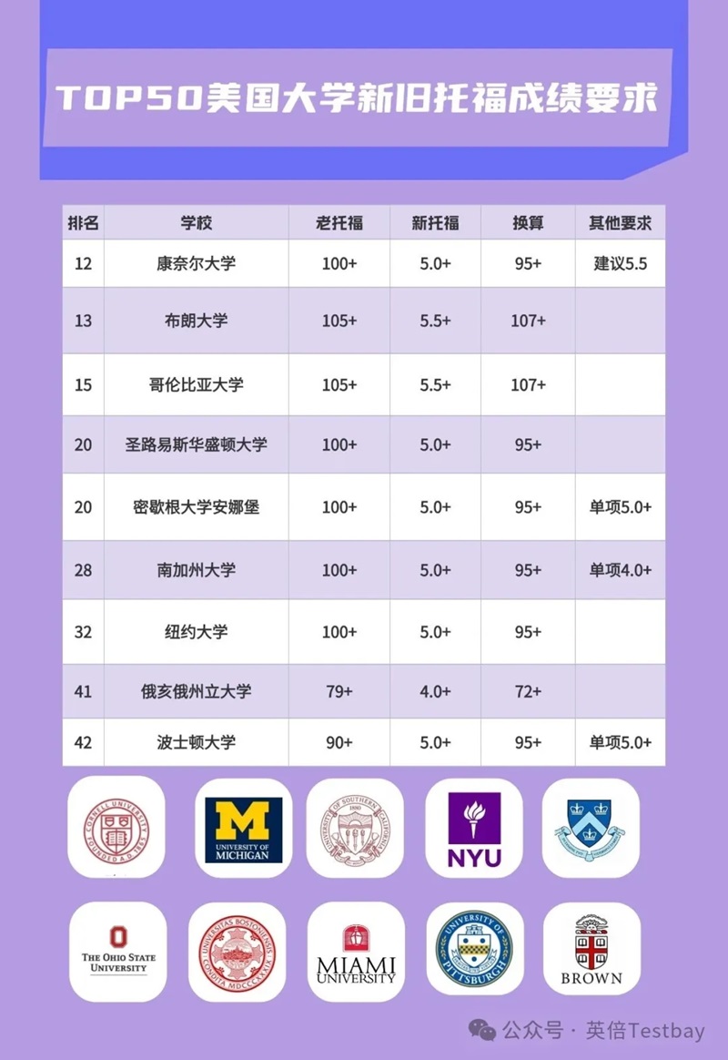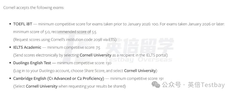 康奈尔大学官方宣布,新托福成绩要求底线为5分,建议达到5.5分;老托福要求为100分。该分数对应旧版托福106-113分,属于顶尖院校的常规高分要求,较改革前无明显下调。