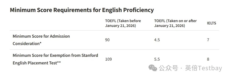 斯坦福大学老托福要求总分最低为90分;新托福要求总分最低为4.5分。新标准4.5+,对应120分制是86+,难度有所降低。