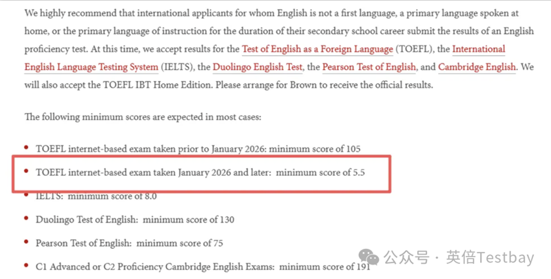 布朗大学原来要求托福105+,新托福是5.5+,对应120分制也是107+,难度也有所提升。
