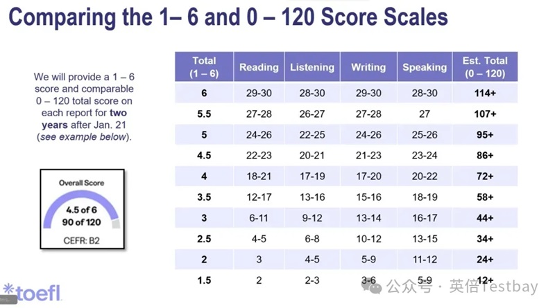 2026年1月21日及之后参加的托福考试,要求总分最低为4.5分。新版托福对应120分制是86+,难度稍有提高。