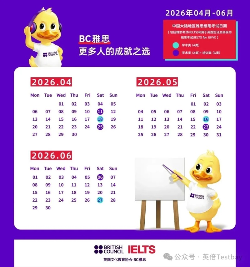 2026年4月-6月共公布7个纸笔考试日期,包括雅思考试(IELTS)和用于英国签证及移民的雅思考试(IELTS for UKVI)。纸笔考试的日期全部设在周六!