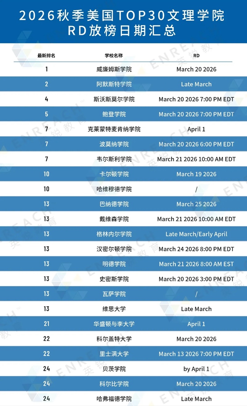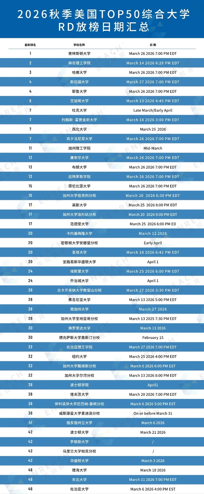 根据往年数据和各校消息,绝大多数Top50综合性大学和Top30文理学院的RD结果,会在3月中旬到4月1日这段时间密集发布。