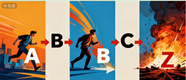 A发生 → 导致B → 导致C → 最终不可避免地产生灾难Z。