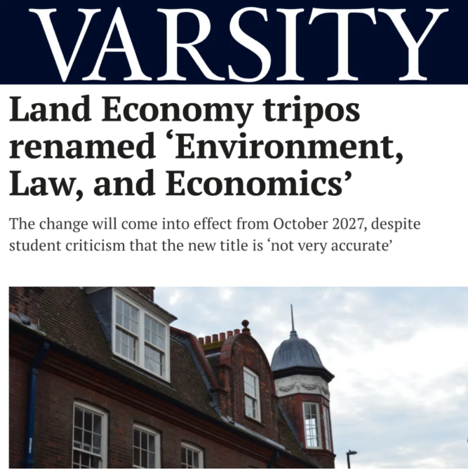 剑桥大学校报 Varsity 也对此次更名采访了多位土地经济专业的学生,并进行报道:他们一致认为现有名称存在问题且“过时”,但对新选定的“环境、法律与经济学”这一名称提出质疑。