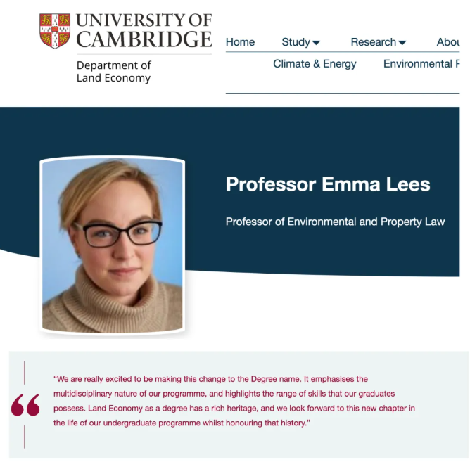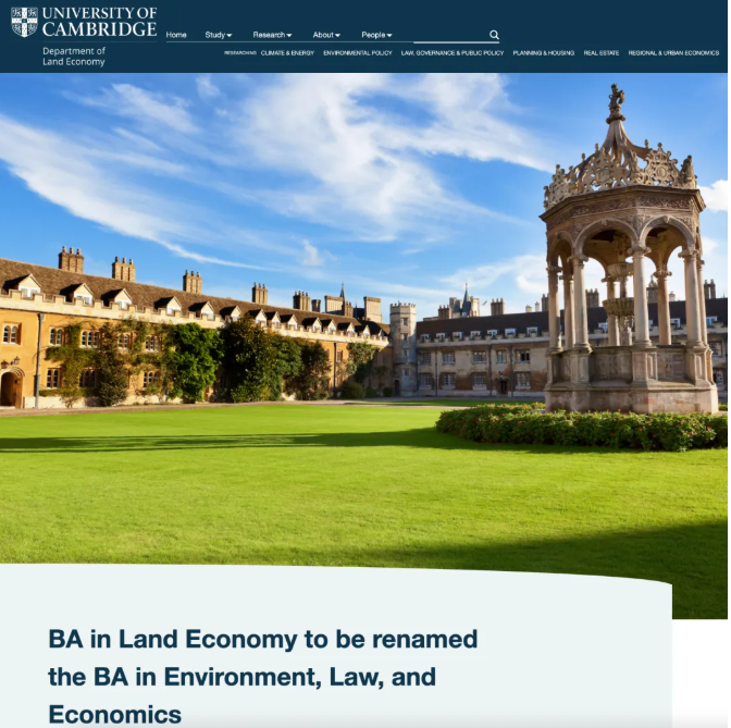 剑桥大学土地经济系日前宣布,自2027/28学年起,其本科专业名称将由“土地经济学士学位”正式更名为“环境、法律与经济学士学位”,后续入学的所有本科生均将适用新名称。