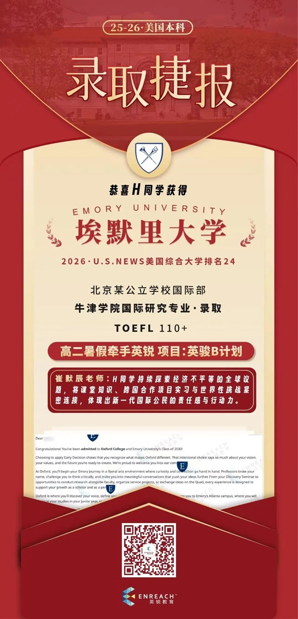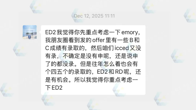 最后一个很重要的点是选校策略。英锐在这方面是比较理性的,没有让我盲目去冲特别高的学校,而是帮我筛选了一些和我匹配度很高的学校,这其实帮我节省了很多时间和精力。在ED2选校的时候,我当时在几所学校之间其实挺纠结的,但崔老师会从匹配度、专业契合度这些角度帮我分析,最后建议我选择埃默里大学。从结果来看,这个决定是非常正确的。