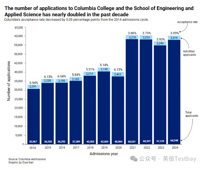 2025年:申请人数约62,000,录取约2,300人,录取率约3.7%。趋势:录取率波动下降,近年稳定在3.5%-4%左右,注重学术创新和多样性。