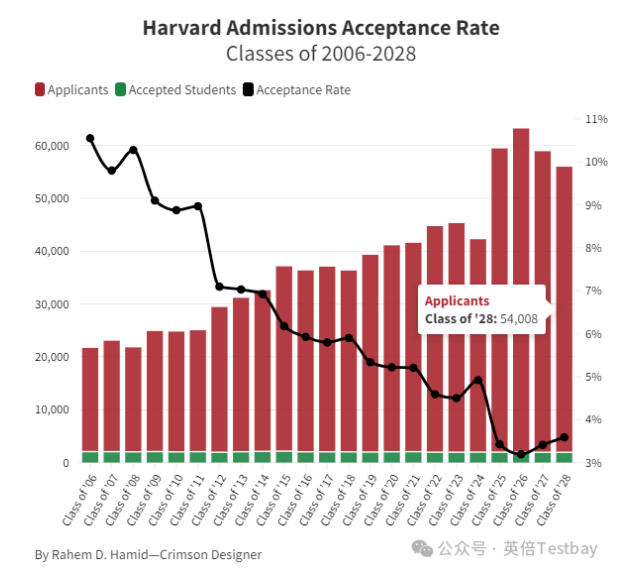 据官方数据,2025年:申请人数57,786,录取2,318人,录取率4.0%。哈佛大学2028届共录取1,937人,整体录取率为3.59%。在早期申请阶段录取了692名学生,早申录取率为8.74%;常规申请录取1,245名申请者,常规申请录取率为2.7%。