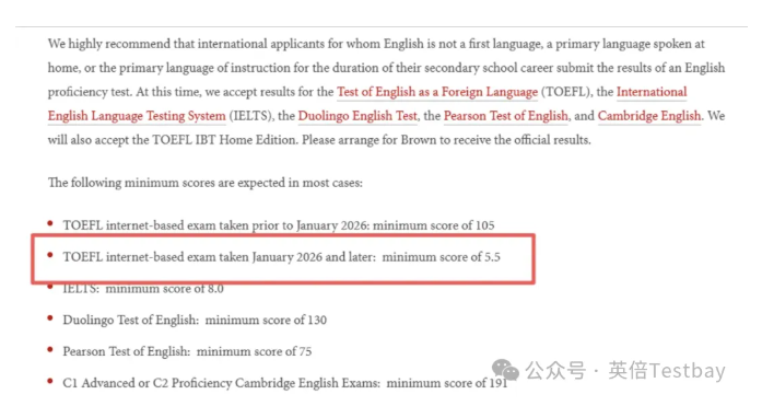 布朗大学原来要求托福105+,新托福是5.5+,对应120分制也是107+,难度也有所提升。