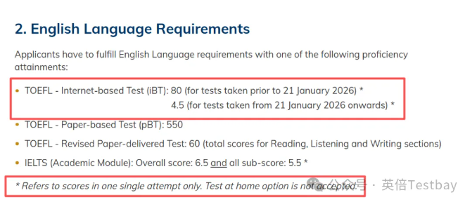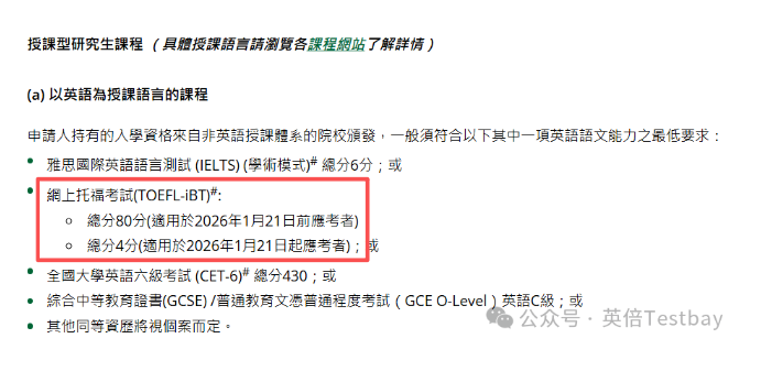 港科大的本科和研究生都已经进行更新。研究生:港科大研究生招生要求页已经明确写明,TOEFL iBT为80(2026/1/21前)或4.5(2026/1/21起);同时注明at-home版本不接受。也不接受拼分。