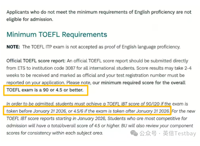 分阶段明确要求:2026年1月前参加的旧版托福,最低要求90分;2026年1月及之后参加的新版托福,最低要求4.5分;2026年1月21日之后的新版托福,最低要求提升至5分。4.5分对应旧版托福84-97分,整体要求与改革前基本持平。