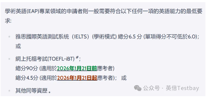 港教大研究生课程的录取要求页面已经更新了新托福的录取要求,以2026年1月21日为分水岭,实行了两套分数标准: