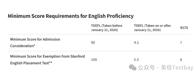斯坦福大学老托福要求总分最低为90分;新托福要求总分最低为4.5分。新标准4.5+,对应120分制是86+,难度有所降低。