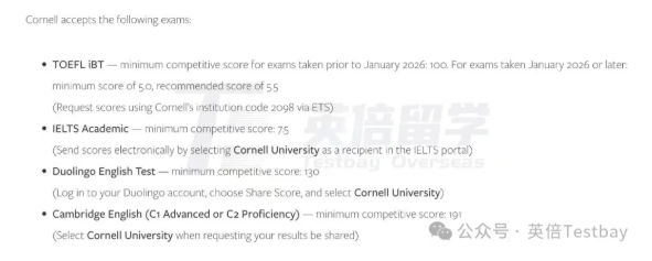 康奈尔大学官方宣布,新托福成绩要求底线为5分,建议达到5.5分;老托福要求为100分。该分数对应旧版托福106-113分,属于顶尖院校的常规高分要求,较改革前无明显下调。