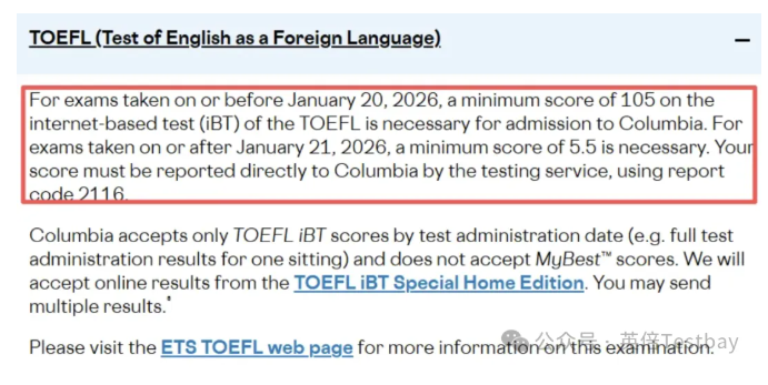 哥伦比亚大学作为常春藤联盟的成员,U.S.News全美大学排名第15位,对语言成绩的要求一直处于较高水平。哥伦比亚大学新托福要求最低 5.5 分,不接受 MyBest 拼分,但认可托福家考。哥大原来要求托福105+,现在要求5.5+,换算成新托福标准是107+,相当于提高了门槛。
