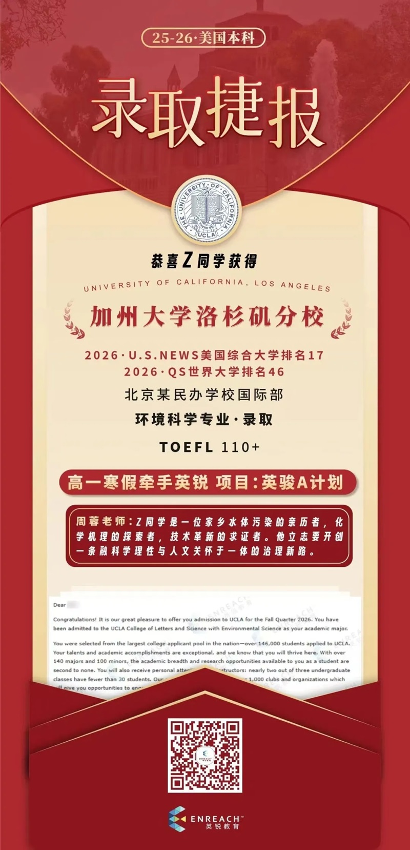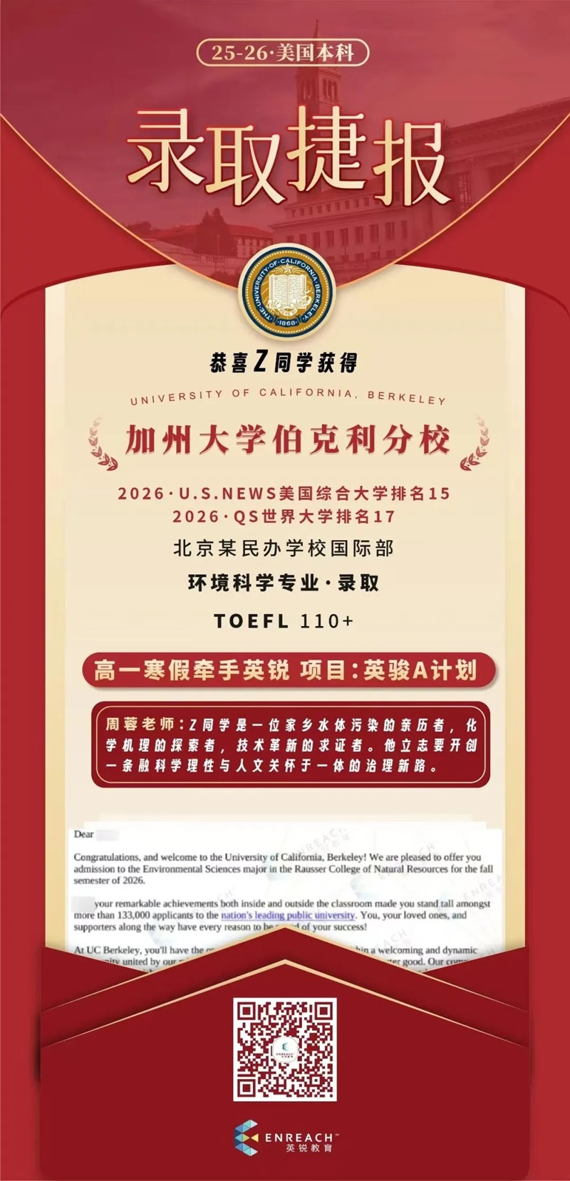 第二,建立“长期主线”,学会展示韧性。尽早确定一个支点(比如我的环境问题),然后在这个方向上持续投入。遇到困难不要回避:我高一GPA曾有波动,Berkeley和LA放榜前也经历过其他学校的拒信,但这些“挑战”反而让故事更真实。招生官看重的是:你如何面对挫折,如何在压力下继续推进。