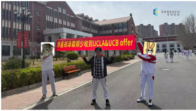 而Berkeley作为我所有申请学校中倒数第二所放榜的(最后一所是没啥悬念的BU),我决定用一种更有仪式感的方式迎接26Fall的结束。那天早上6:30放榜,我特意忍住了在家拆Offer的冲动,赶到学校,在实验楼一楼大厅和朋友们一起拆这个Offer。在我拆完Offer之后,他们突然拉出来一个惊喜横幅,上面写着庆祝我创造了人朝分第一个加州TOP2 “双录取”!