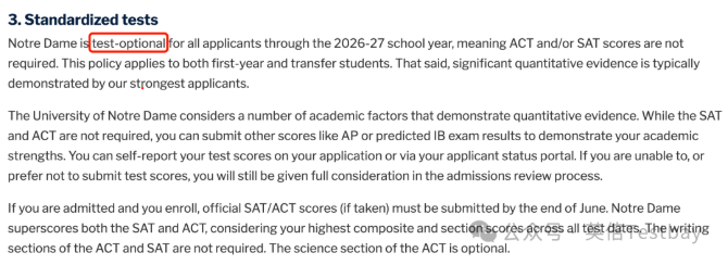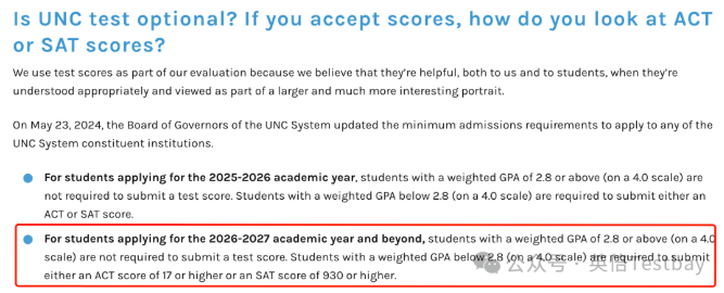 北卡2027Fall要求学生递交标化成绩,但是满足以下条件的同学可以豁免: