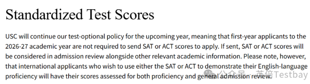 南加州大学在27fall美本申请季中继续实行标化可选政策。如需提交,ACT/SAT成绩将于其他的学术信息一起纳入录取审核。