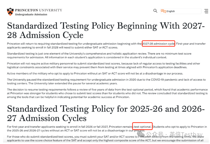 普林斯顿大学官宣,2027Fall将继续标化可选的标化政策,但是2028Fall开始将恢复递交标化的要求。