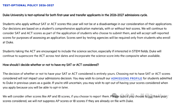 杜克大学宣布,2027Fall将继续采取标化可选政策。此外,杜克还提到鼓励参加ACT的学生参加 science section的考试,尤其是申请STEM专业的学生。