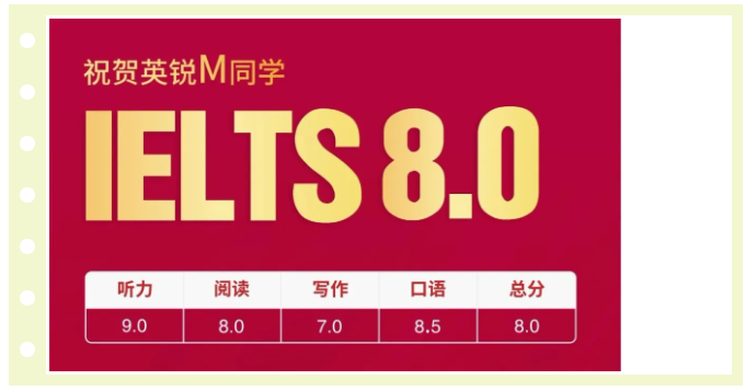 其实对于8.0这个成绩,M同学表示完全没想到的,她原本以为可能得个7分或者7.5差不多。查分结果一出来,完全惊喜了也!!!M同学究竟是怎么样在“意料之外”拿了个8.0的?
